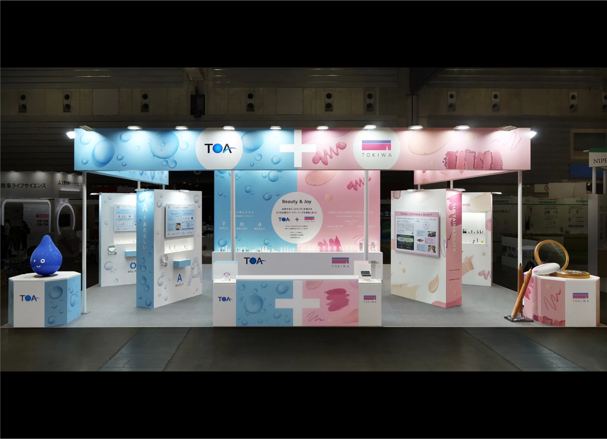 化粧品のODM/OEMのTOA株式会社(旧:日本コルマー)さまと、コスメティックの株式会社TOKIWAさまがパートナーシップを締結後、初の共同出展「CITE JAPAN 2025」の展示ブースなどのお手伝いをいたしました。TOAとTOKIWAがパートナーになったことをブース全体で大きくメッセージしながら、両社の特徴を明確にアプローチすることを心がけました。